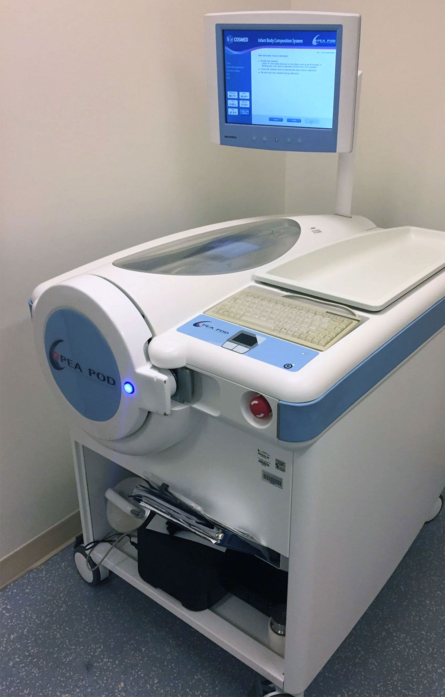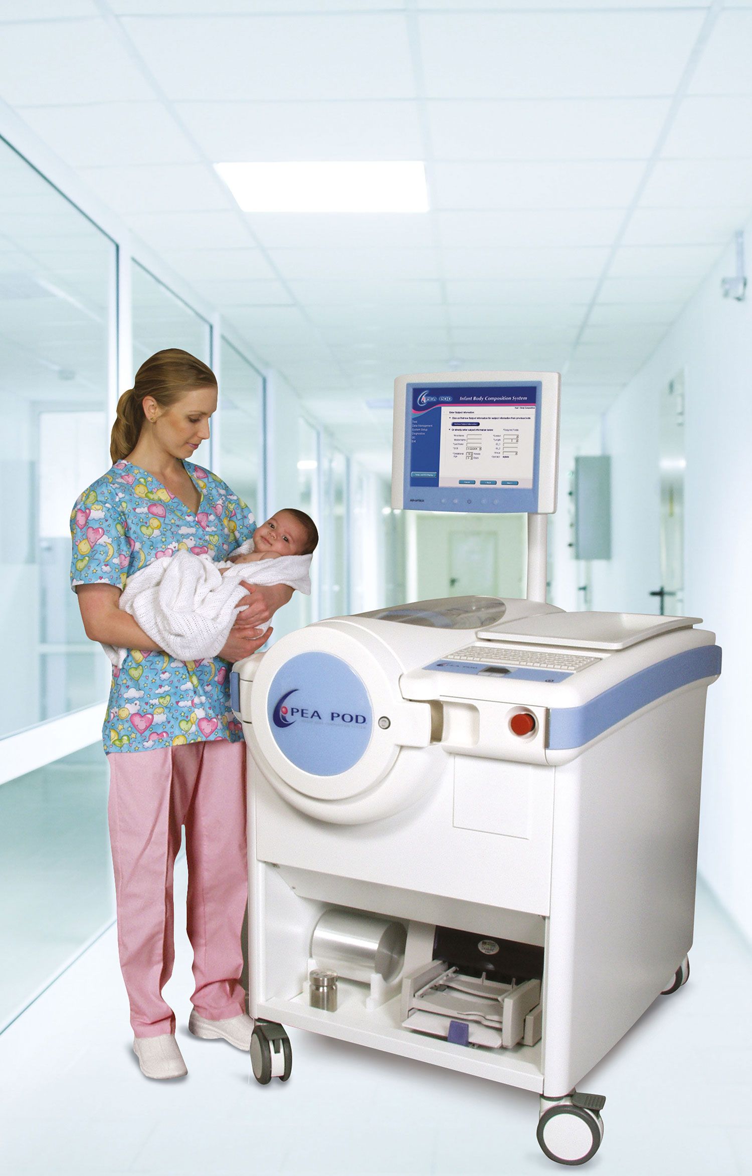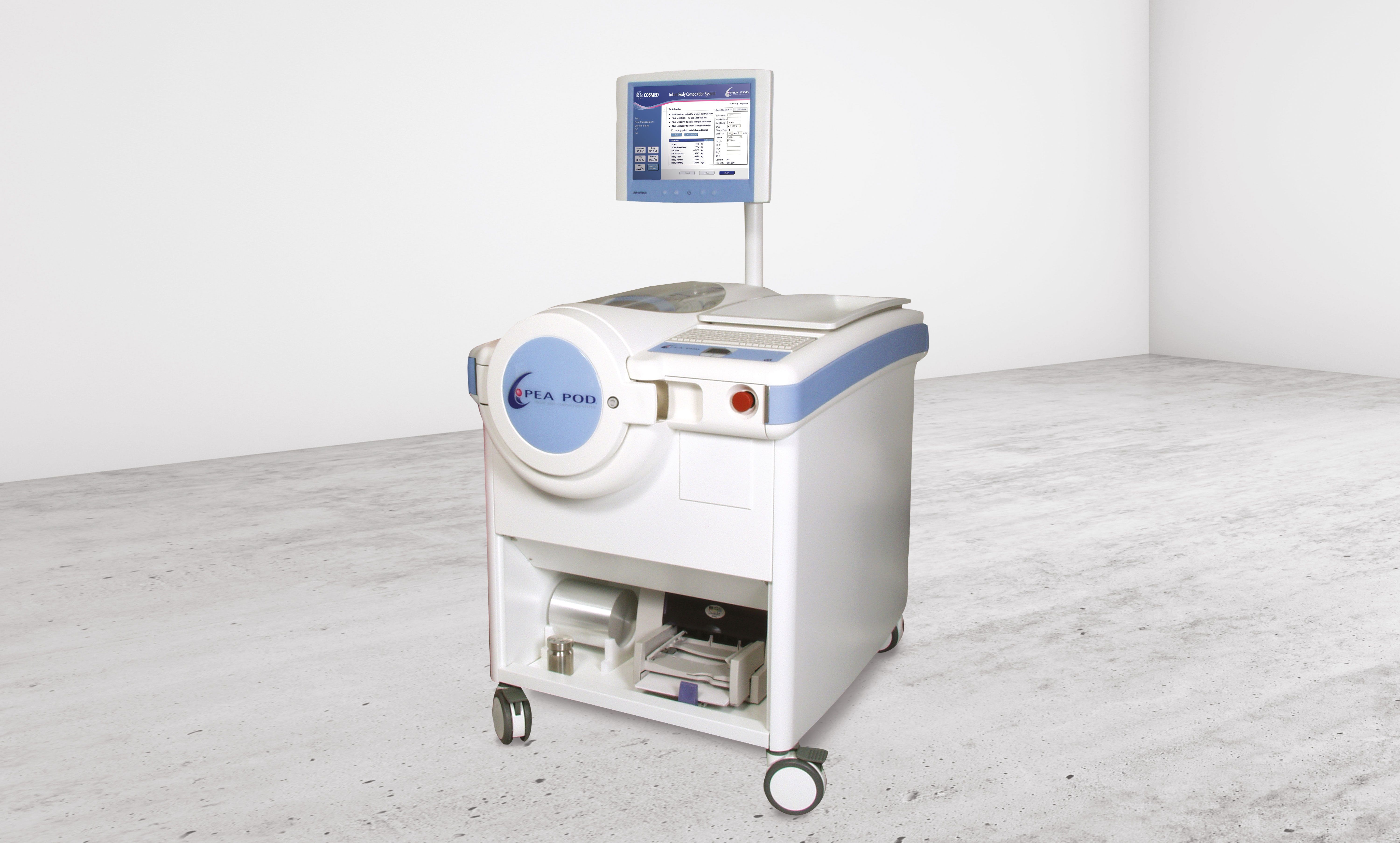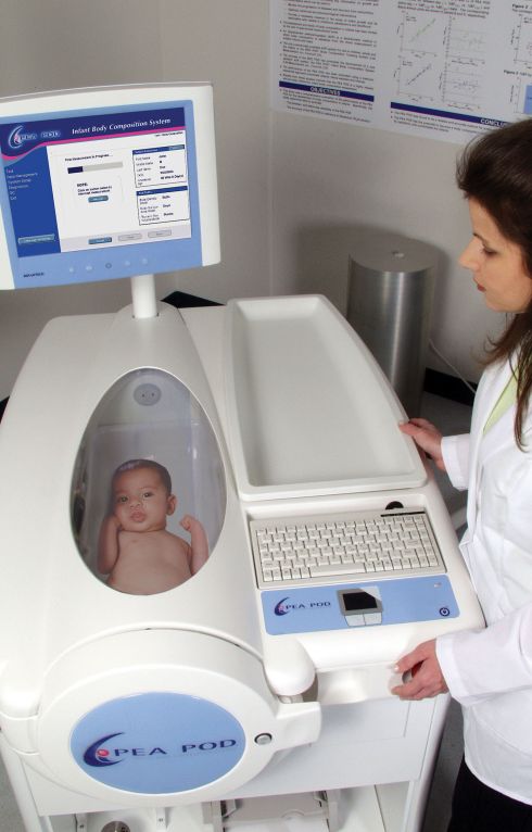 Le PEA POD est un système de pléthysmographie par déplacement d'air (ADP) qui permet de mesurer la composition corporelle (masse grasse et masse non grasse) des nourrissons entre 1 et 8 kg par densitométrie du corps entier.