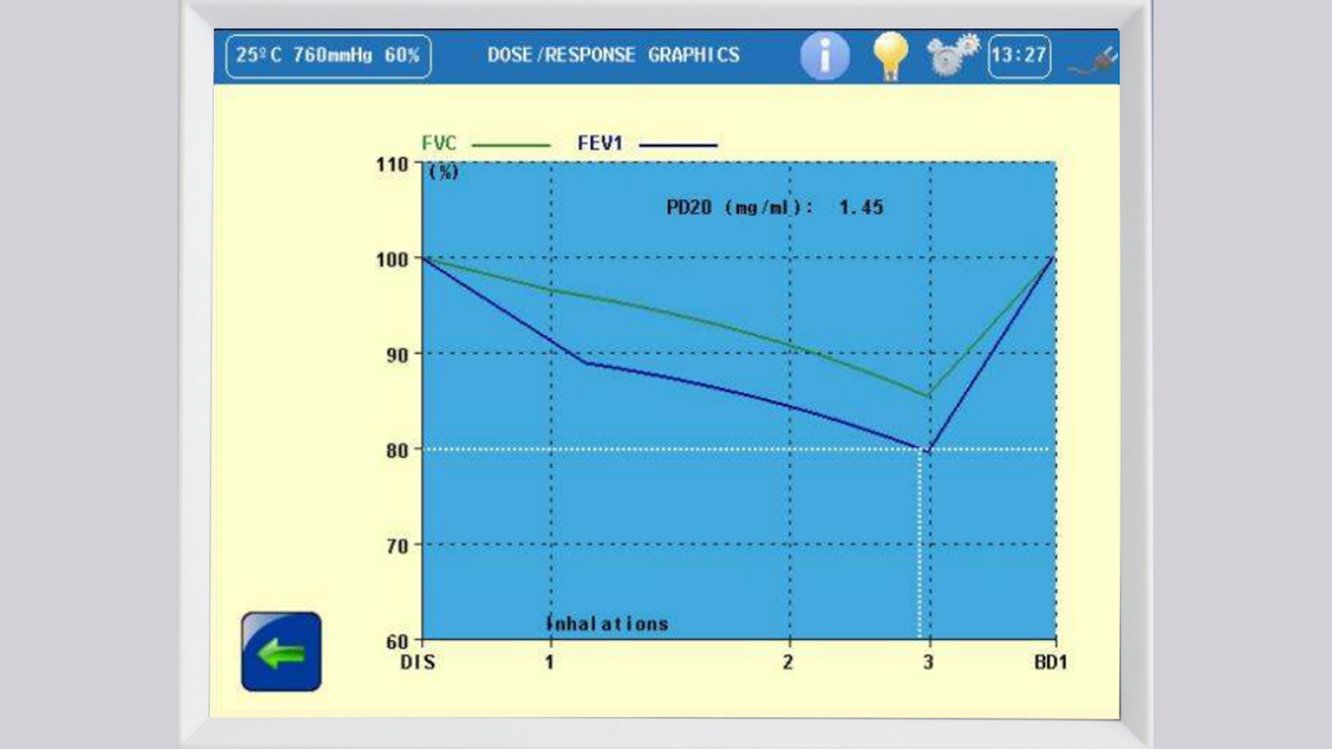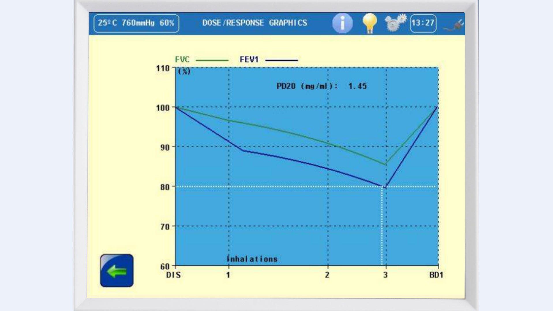 - Quantifica la sensibilità delle vie aeree monitorando le variazioni della funzione polmonare dopo l’esposizione ad agenti broncocostrittori.